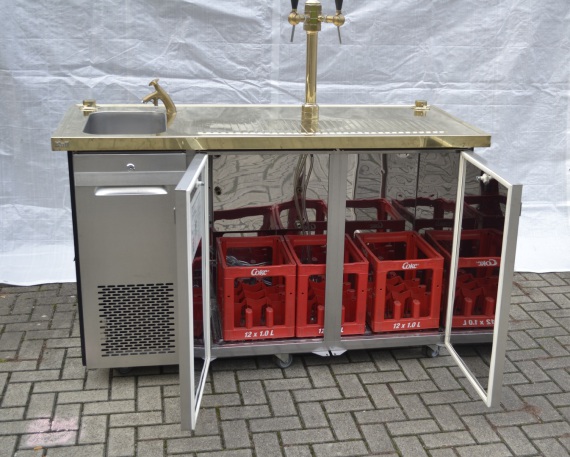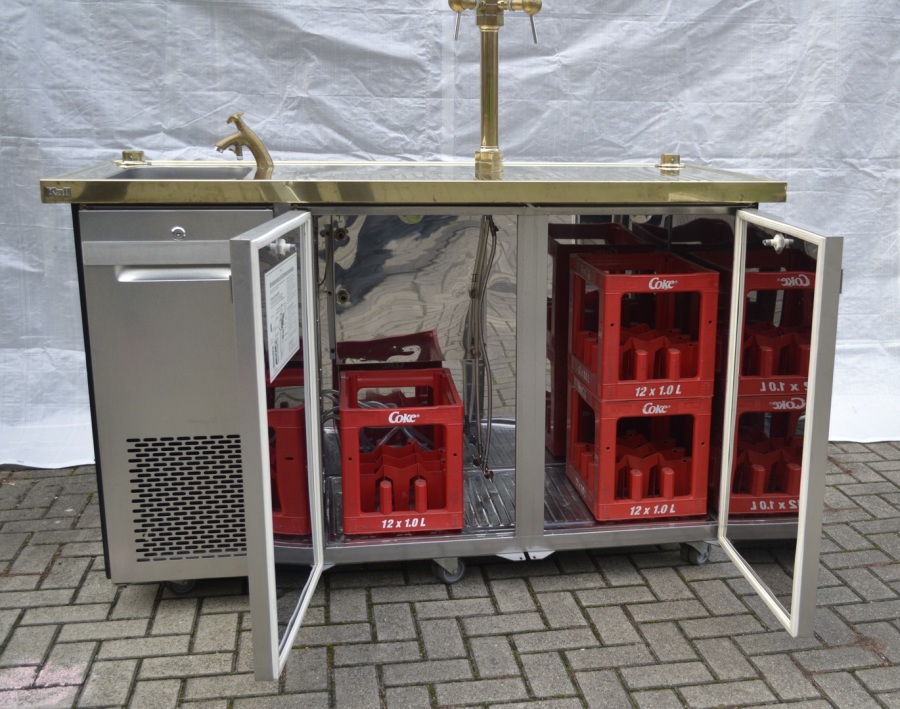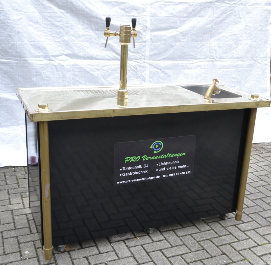 Des weiteren ist ein Tiefspülbecken verbaut. Im geräumigen Kühlraum im Thekeninneren passen mindestens sechs Getränkekisten (12x1l) rein. Es können auch wahlweise Fässer im Thekeninnenraum verstaut werden oder außerhalb der Theke gelagert werden um so die maximale Kühlfläche zu erhalten.